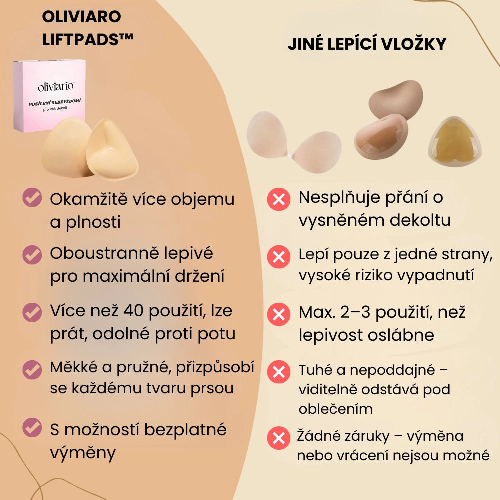 LiftPads od Oliviaro jsou jediné vložky na trhu, které jsou pružnější, měkčí a oboustranně lepivé.