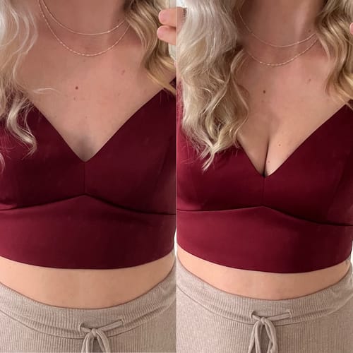 1.Mám top, který se pořád posouvá a odhaluje nalepovací podprsenku, i když použiji oboustrannou pásku. Tyto vložky ho udržely na místě a zabránily tomu, aby se top hýbal.
