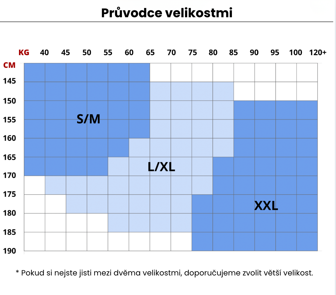 Dostupné ve třech velikostech: velikost S/M je doporučena pro čísla 34–38, velikost L/XL pro čísla 40–44 a velikost XXL pro čísla 46–52. Materiál je elastický a přizpůsobí se všem typům postav.